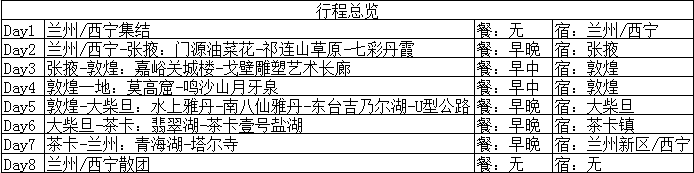 2.如您抵達時間較早,我社為您推薦蘭州周邊景點:中川小鎮、蘭州長城西部影視城、蘭州黃河風情線、蘭山公園、黃河樓、甘肅省博物館、蘭州老街、水墨丹霞等景區;您可根據自身情況前往景區游覽,產生費用需自理!