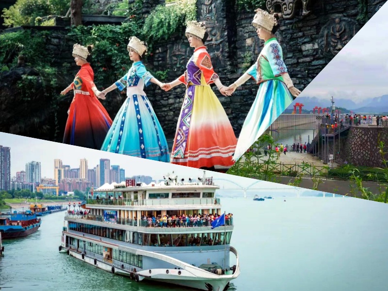 10:10- 14:30:下船游覽山上人家(石令牌、 巴王宮、茶鹽古道非遺傳承一條街、巴王寨,三棵樹廣場觀看演出)。自理中餐后游覽龍津溪(龍溪橋、鵲橋、婚嫁樓表演、峽江號子、迎賓表演)。