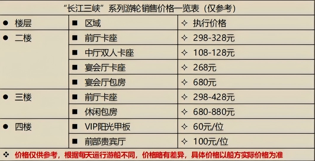 4、長江三峽系列升船機游船上個人消費,包房480元起,卡座128元起,觀景平臺50元起(具體價格以船方報價為準)。備注:長江三峽系列豪華游船一樓大廳,二樓前廳、宴會廳設(shè)有部分免費限量流動座位,二樓、三樓設(shè)有自愿消費的卡座及包房區(qū)域,該區(qū)域為固定座位,四樓有自愿消費觀景臺(1.2米以上即需要購票),座位流動不固定。