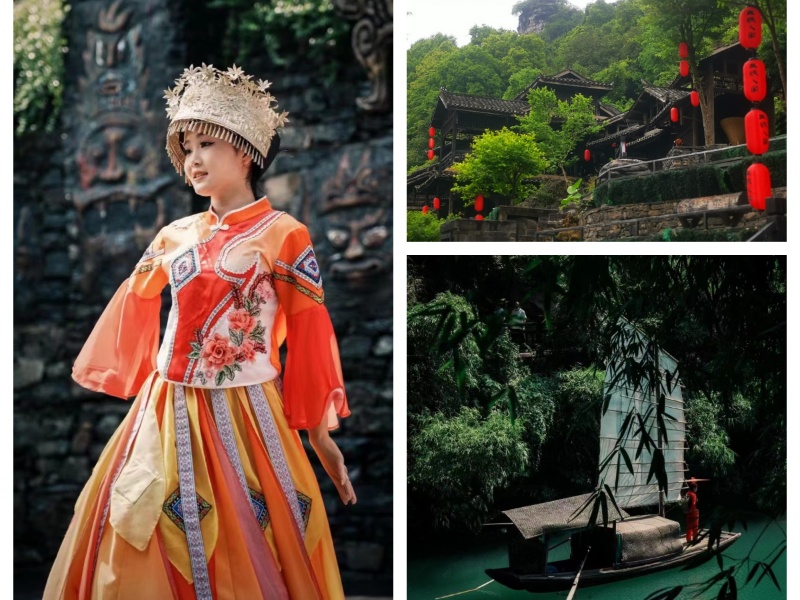 10:00游覽三峽人家(石令牌、 巴王宮、茶鹽古道非遺傳承一條街、巴王寨,三棵樹廣場觀看演出)。自理中餐后游覽龍津溪(龍溪橋、鵲橋、婚嫁樓表演、峽江號子、迎賓表演)。